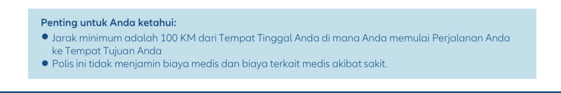 Kedua jenis paket Asuransi Perjalanan Dalam Negeri Allianz itu hanya berlaku untuk perjalanan wisata atau perjalanan bisnis antar daerah (perjalanan dengan jarak lebih dari 100 km) di seluruh wilayah Indonesia.