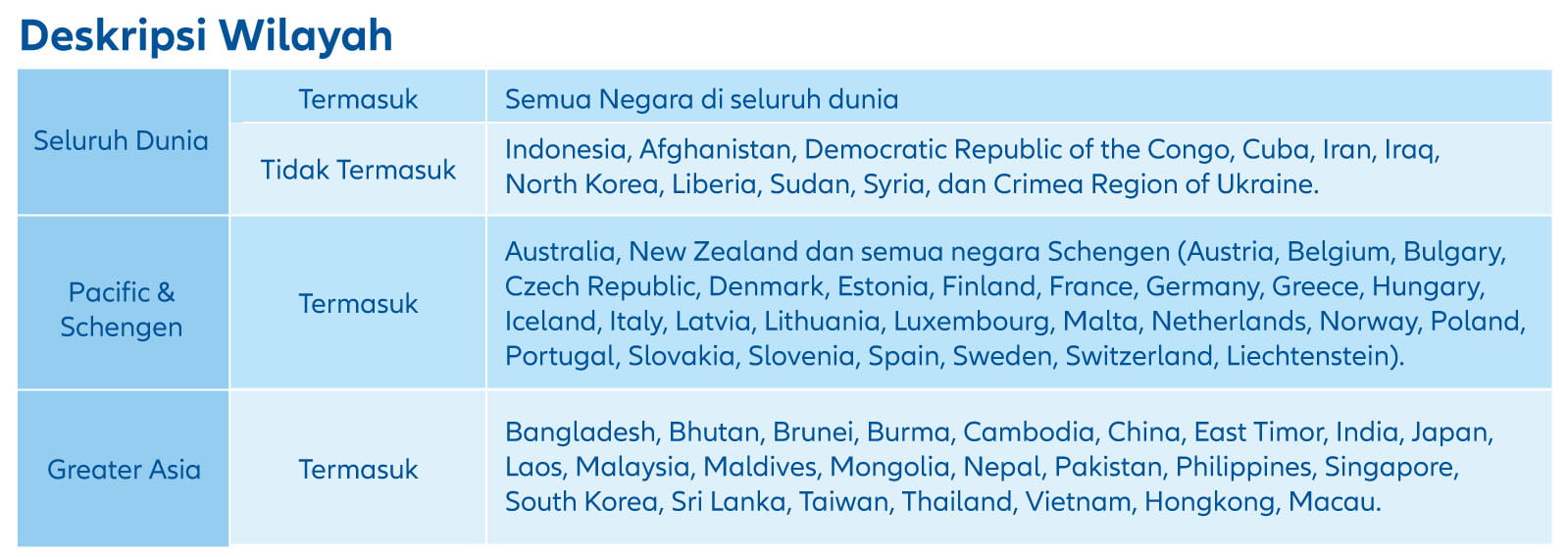 Asuransi perjalanan Allianz memberikan proteksi ke negara tujuan manapun Anda pergi termasuk ke benua Asia, Amerika, Eropa, Afrika Australia dan lainnya. Jika dikelompokkan maka Allianz Travel Insurance ini berlaku saat Anda bepergian ke negara sebagai berikut :