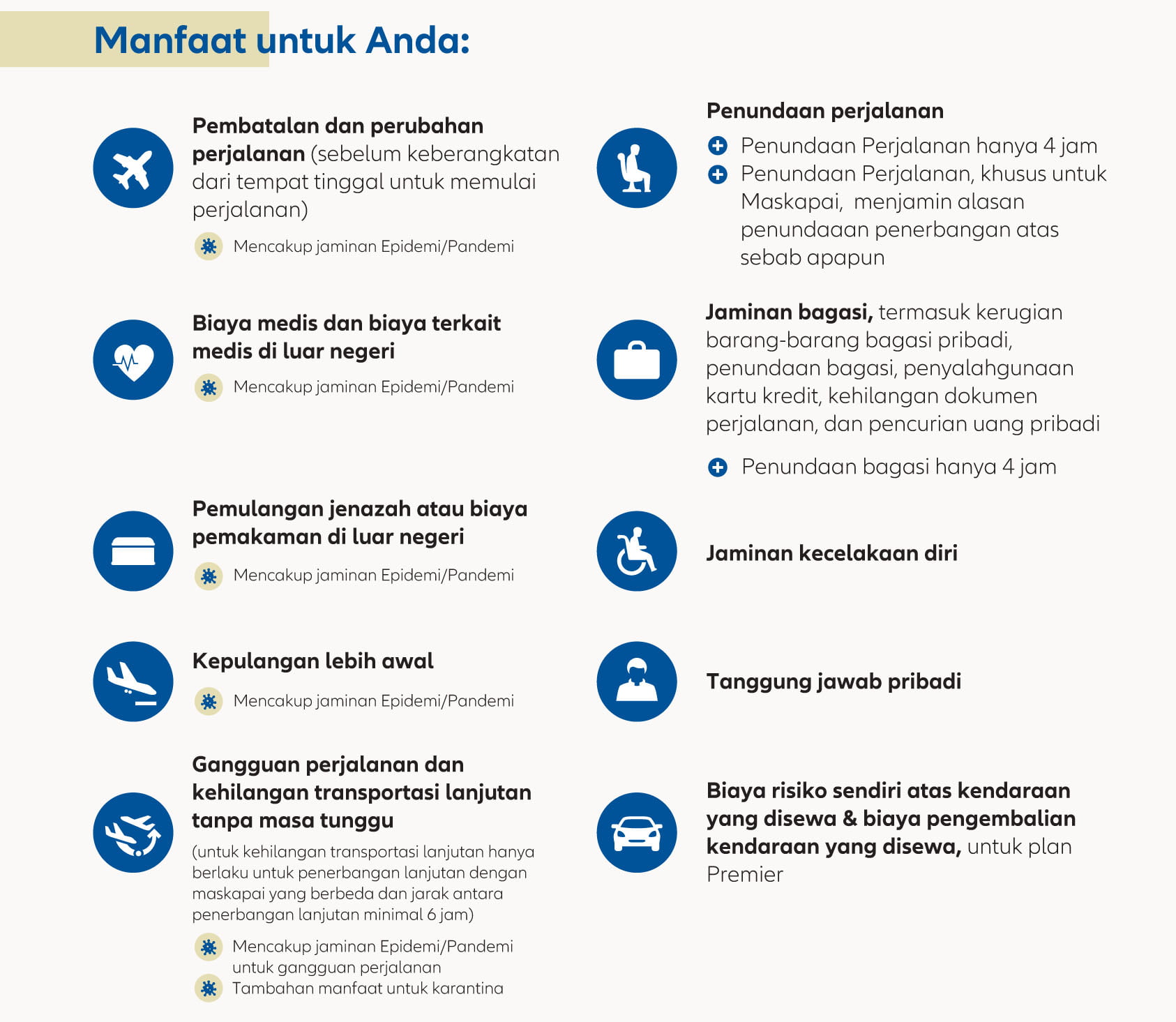 – Manfaat kehilangan transportasi lanjutan tanpa masa tunggu (hanya valid dalam penerbangan lanjutan menggunakan maskapai yang beda dan jarak antara penerbangan lanjutan dengan waktu minimal 6 jam)