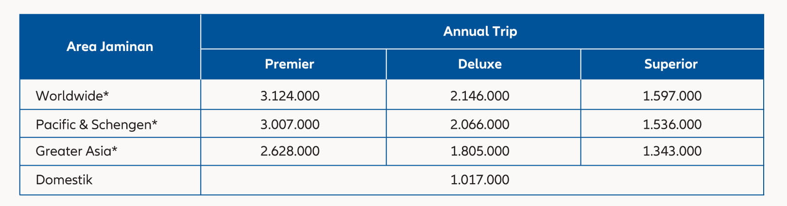 NB : Tidak tersedia paket pasangan atau paket keluarga (family) untuk asuransi perjalanan tahunan Allianz.