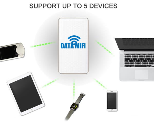 Anda dapat kongsi/share koneksi internet wifi dari modem DATA MIFI ini sampai dengan 5 buah device. Artinya Anda dapat mengkoneksikan smartphone, tablet, laptop Anda sampai batas 5 gadget sekaligus dalam waktu bersamaan. Atau jika tidak, Anda juga dapat sharing koneksi internet wifi dengan teman seperjalanan Anda.